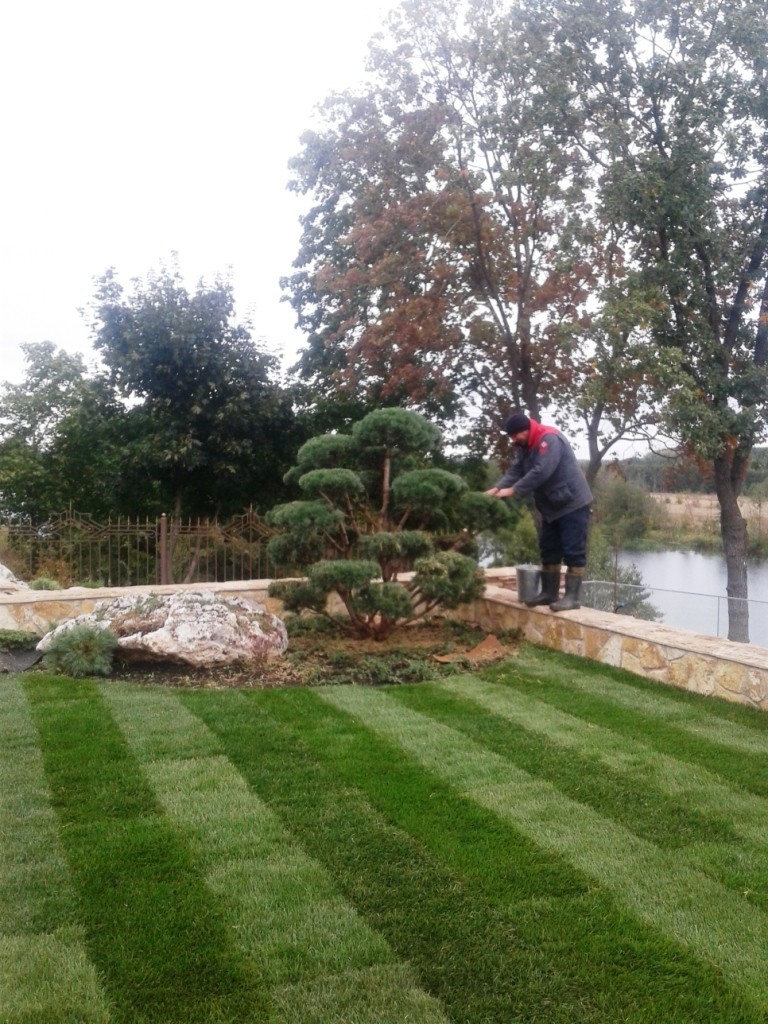 Это самый быстрый способ получения газона. Он заключается в укладке уже готового газона. Большое внимание нужно уделять качеству газона при его покупке. Однако, его транспортировка связана с определенным риском, т.к. срок хранения газона в рулонах — несколько дней.